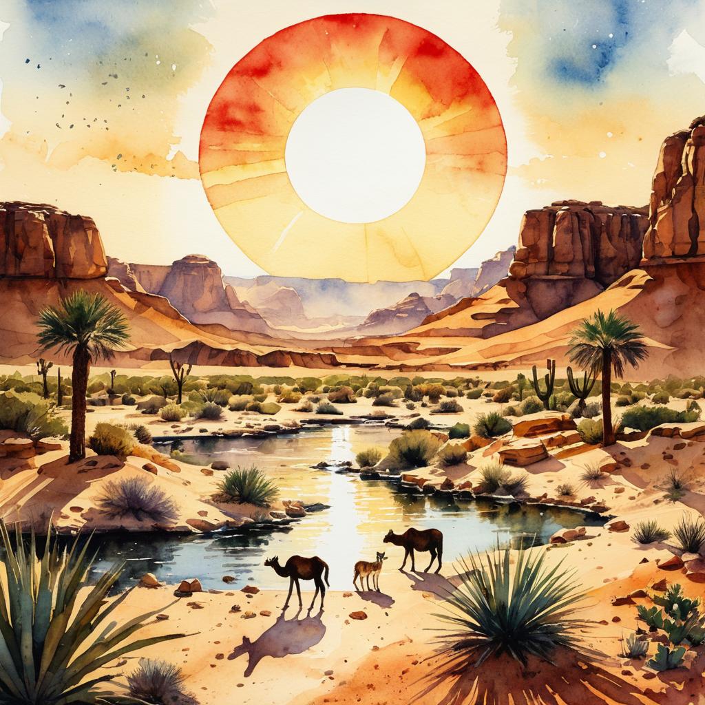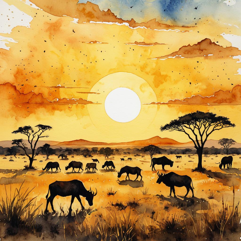 Watercolor painting of a golden savanna sunset, featuring a big shining sun at the center of the frame. Animals roam throughout the landscape, with vibrant golden yellows and burnt siennas and expressive watercolor textures.
