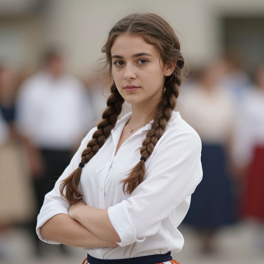 "morris dancing costume, 1girl, solo, looking at viewer, braid, realistic, blurry background, blurry, brown hair, shirt, white shirt, long hair Realistic photo of casual sexy person with pretty face"