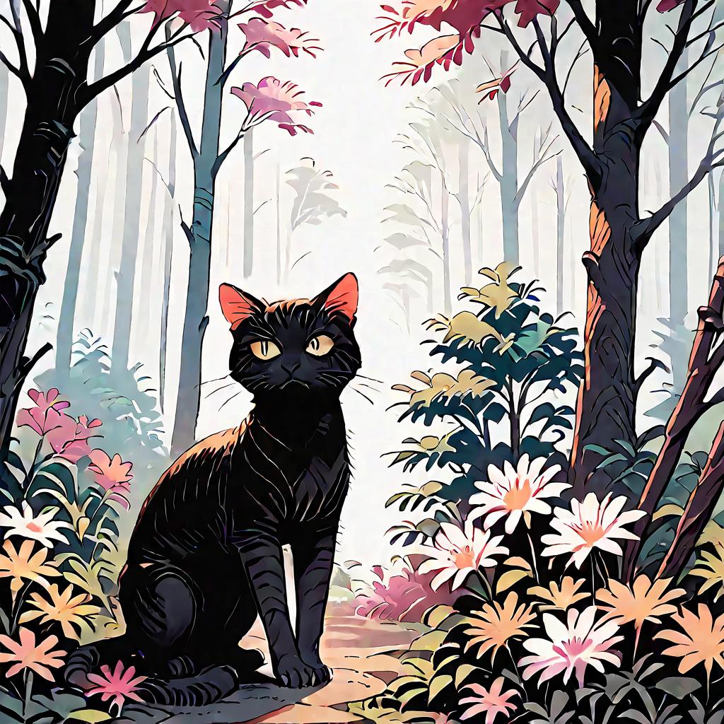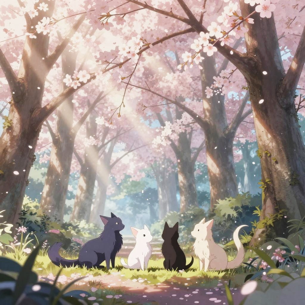 Anime text to image AI generating a serene forest scene with mystical creatures, cherry blossoms fluttering in the wind, delicate light rays filtering through the trees, rendered in soft pastel colors with fine anime-style details.