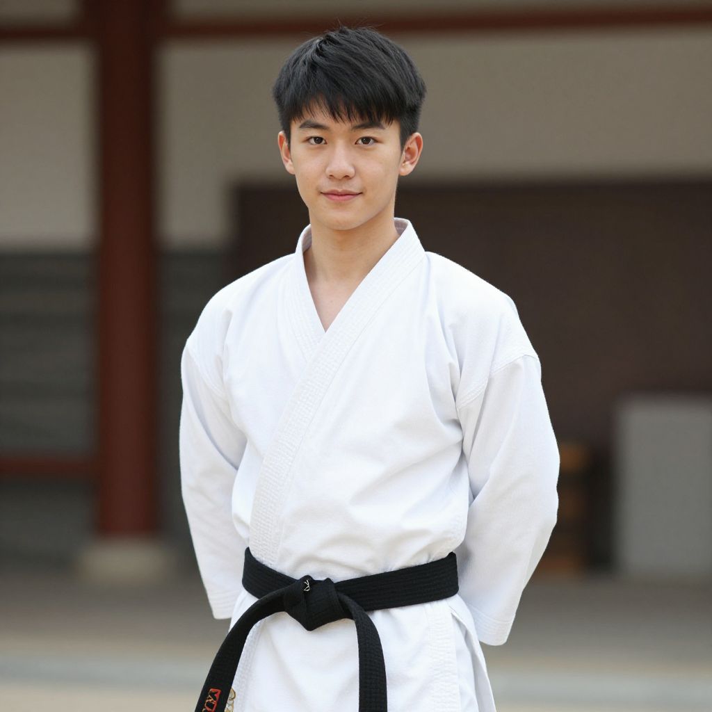 Photograph of a young Asian boy with short black hair, standing outdoors in front of a traditional Japanese building with wooden beams and a dark brown wall. He is wearing a white karate gi with a black belt tied around his waist, indicating an advanced rank. His expression is calm and slightly smiling. The background is slightly blurred, focusing attention on the boy. The lighting is natural, highlighting his smooth skin and the crisp texture of his uniform. The image conveys a sense of discipline and tradition.