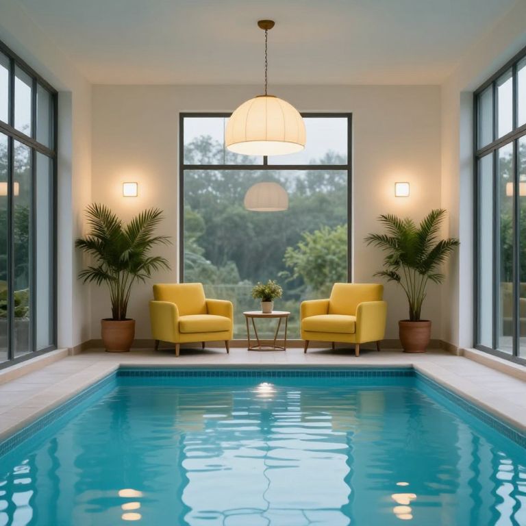 Luminous indoor pool surrounded by expansive windows, featuring two yellow armchairs flanked by potted plants, a hanging pendant light above, and recessed wall sconces illuminating the serene space.