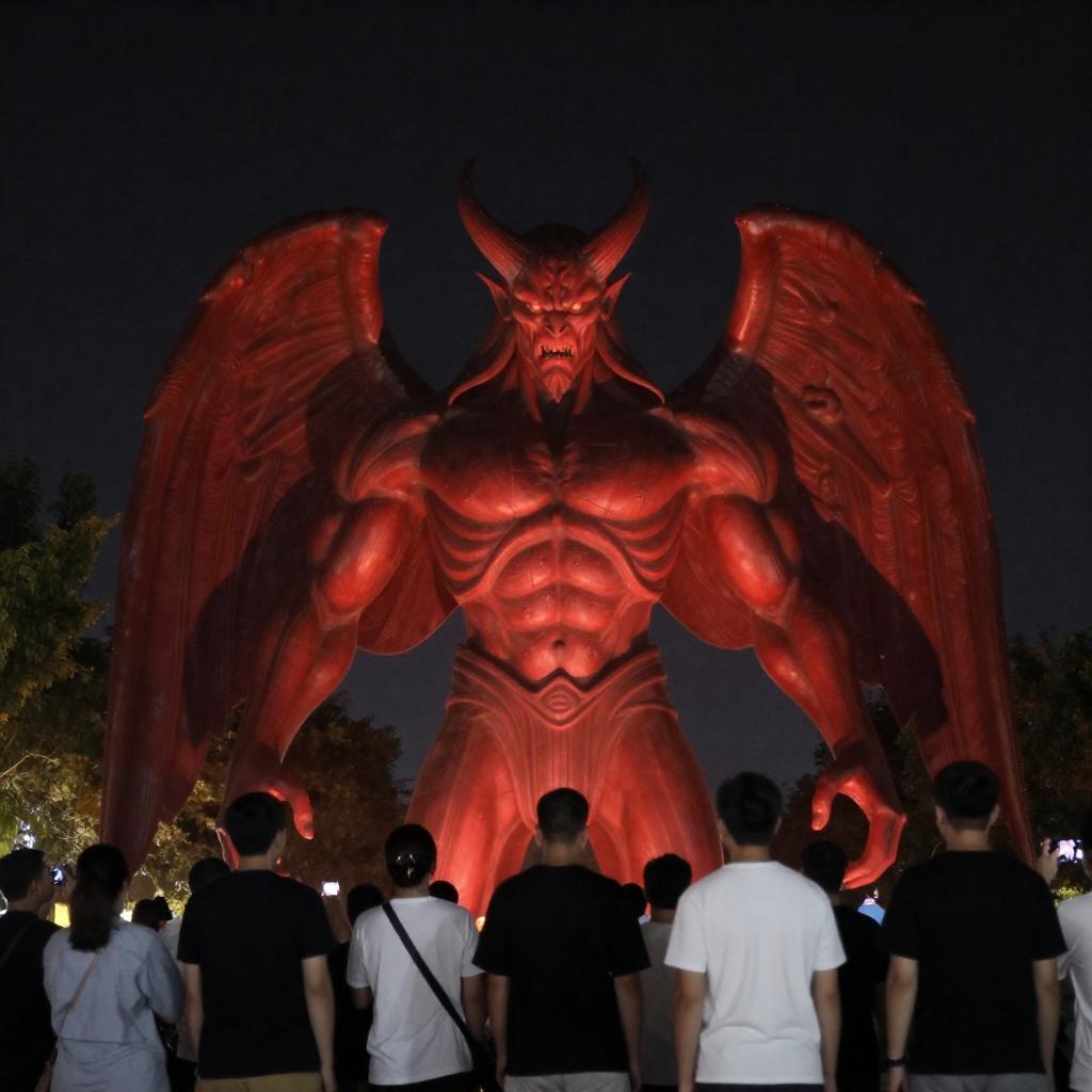 Photograph of a large, red, glowing, demonic statue with horns, wings, and glowing eyes, towering over a crowd of people at night. The statue's muscular, menacing figure looms above, with people in casual clothing standing below, some taking photos. The background is dark, with trees partially visible.