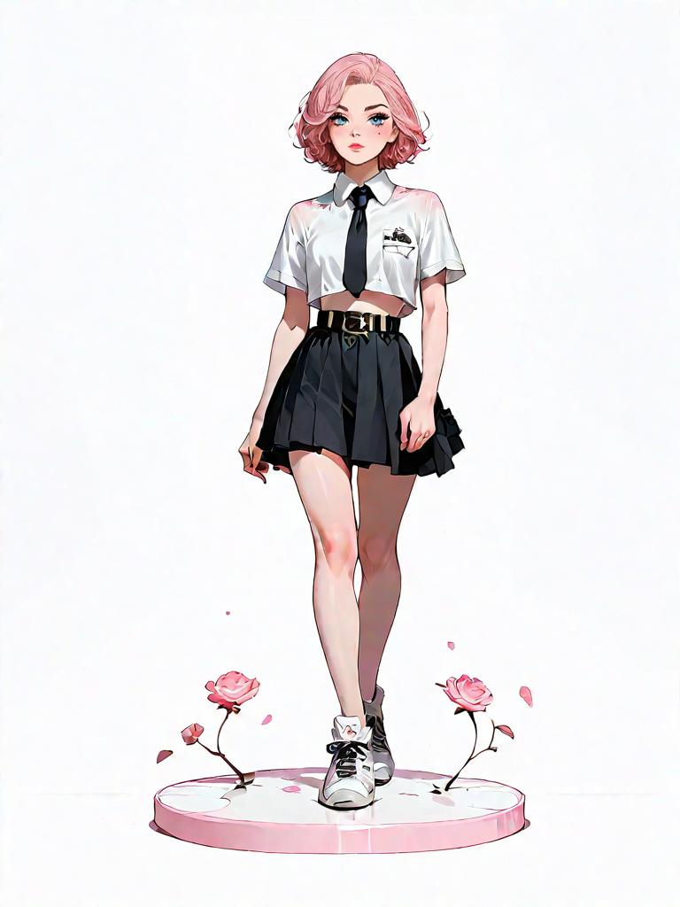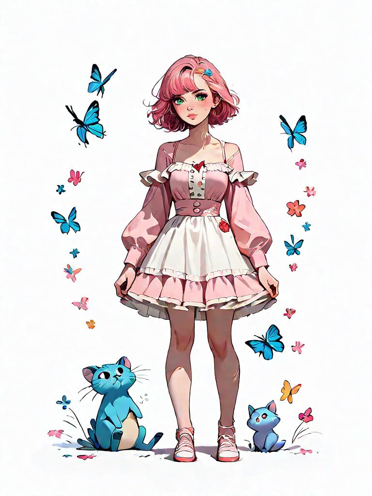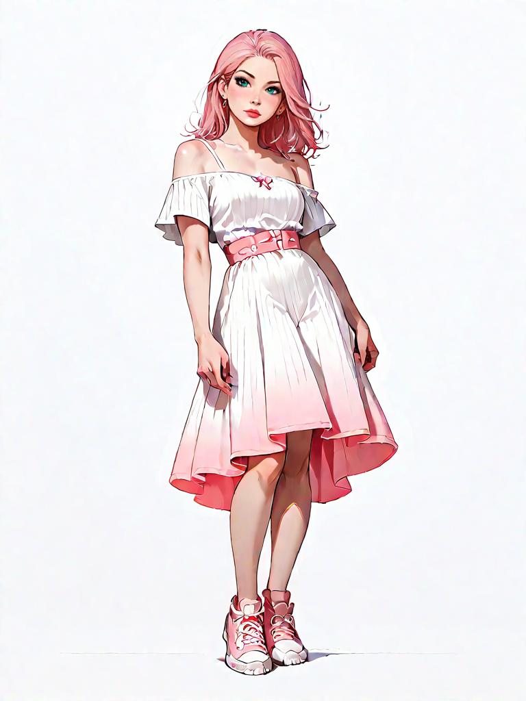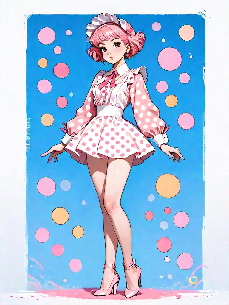 1girl, source_comics, realistic face, full body shot, Woman, romantic, blush pink mini dress with polka dots, deep V-neckline with ruffle detailing, long sheer sleeves with elastic cuffs, ruffle hem, simple light pink heels, minimal jewelry, white studio background.