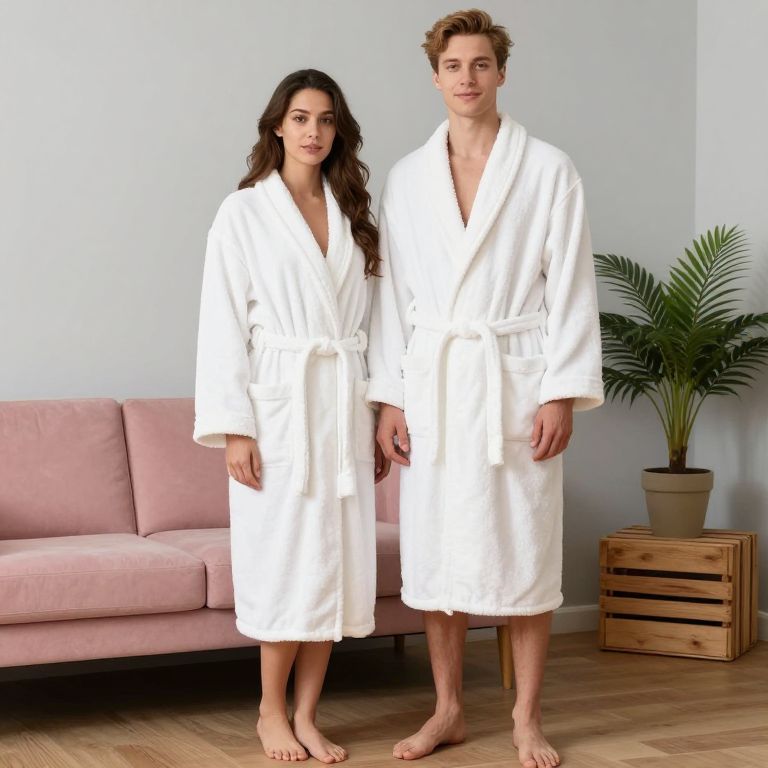 Photograph of a couple standing side by side in a modern living room. Both are wearing white, fluffy bathrobes with ties, standing barefoot on a wooden floor. The woman, with long dark hair, has a medium build and olive skin. The man, with short light brown hair, has a lean build and fair skin. They stand in front of a pink sofa on the left and a wooden crate with a green potted plant on the right. The background wall is light gray. The image has a clean, bright aesthetic with soft lighting.