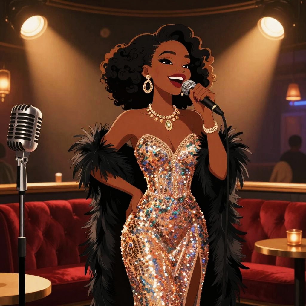 Reimagined cartoon antihero as a vibrant biracial female pop star at neon stage with holographic screens and lively audience, rendered in glossy cel-shaded animation with sparkling highlights and bold contrast; confident energetic attitude; detailed clothing and accessories (sequined jacket, leather pants, platform boots, statement necklace); dynamic pose with dramatic spotlight framing; holographic logos and light beams; saturated colors and bold contrasts; crisp linework and halftone textures; soft rim light and subtle motion lines; shallow depth of field; digital illustration; ultra-detailed urban vibe.