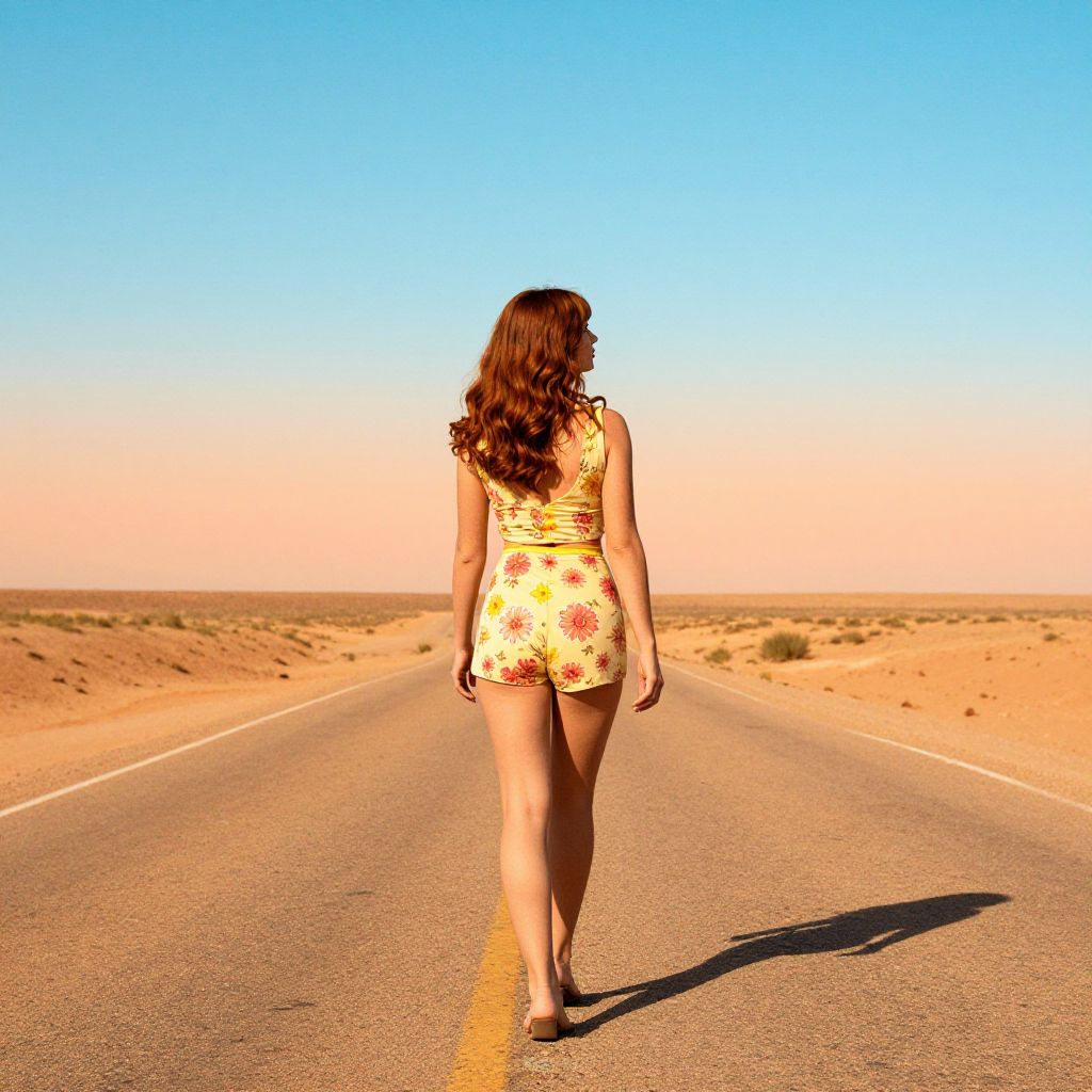 Photograph of a woman with long brown hair, wearing a floral sleeveless romper, walking alone down a desert road under a clear blue sky.