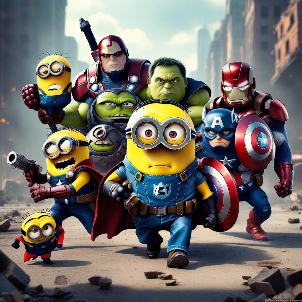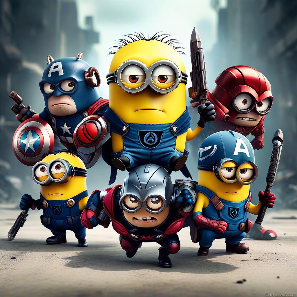Humorous crossover of Minion Avengers, combining The Avengers and Minions characters, playful and satirical, vibrant colors, digital art, exaggerated expressions