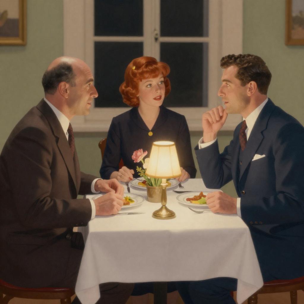 Black-and-white photograph of a family dining together. A man in a dark suit sits on the left, a woman with short hair in the center, and a young girl with long hair on the right. A blonde child leans forward. The table is set with plates, cups, and a teapot. A landscape painting hangs on the striped wall in the background.