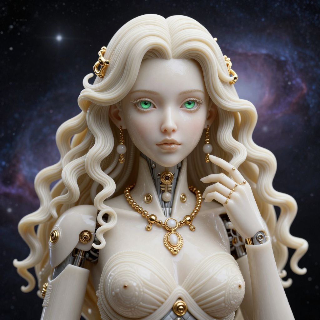 A highly detailed 3D rendering of a futuristic, porcelain-like woman with intricate gold jewelry, deep green eyes, and long, curly hair, transforming into an ivory cyborg with a nebula background.