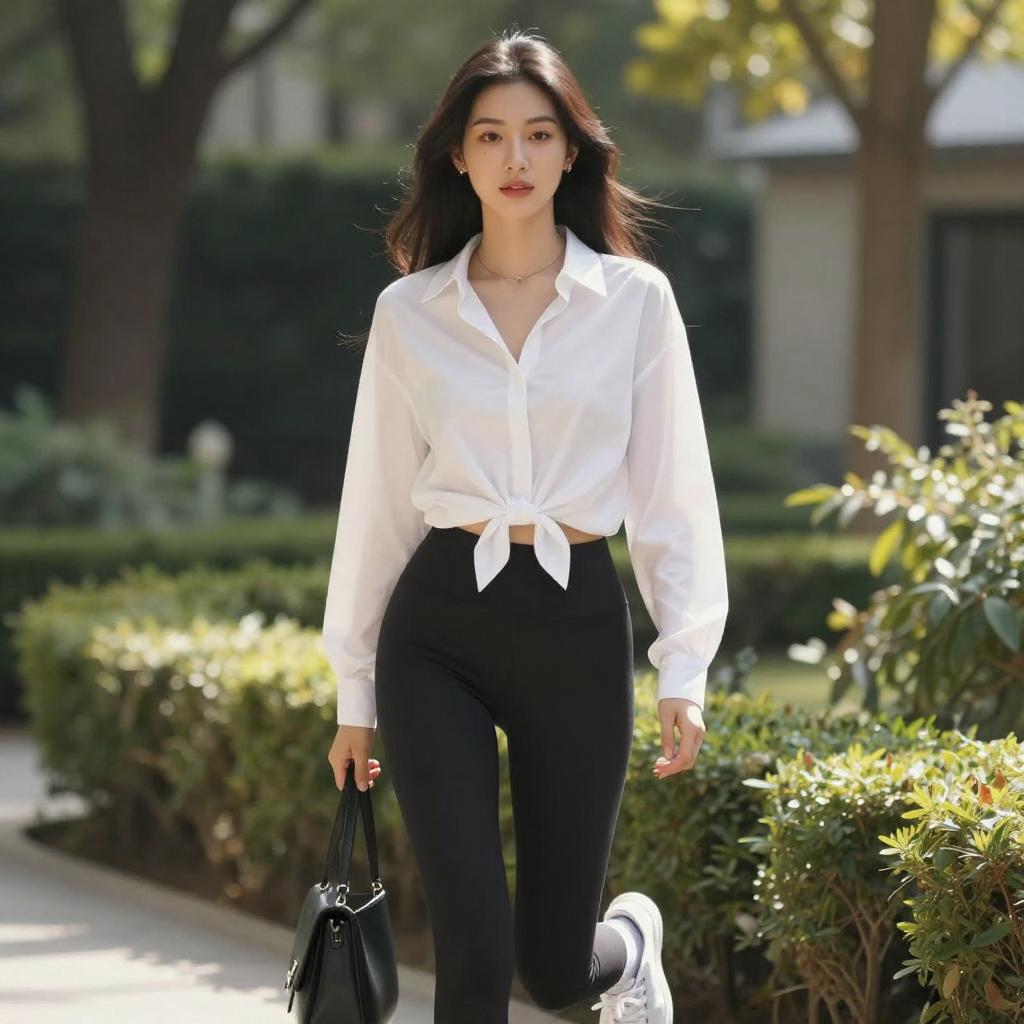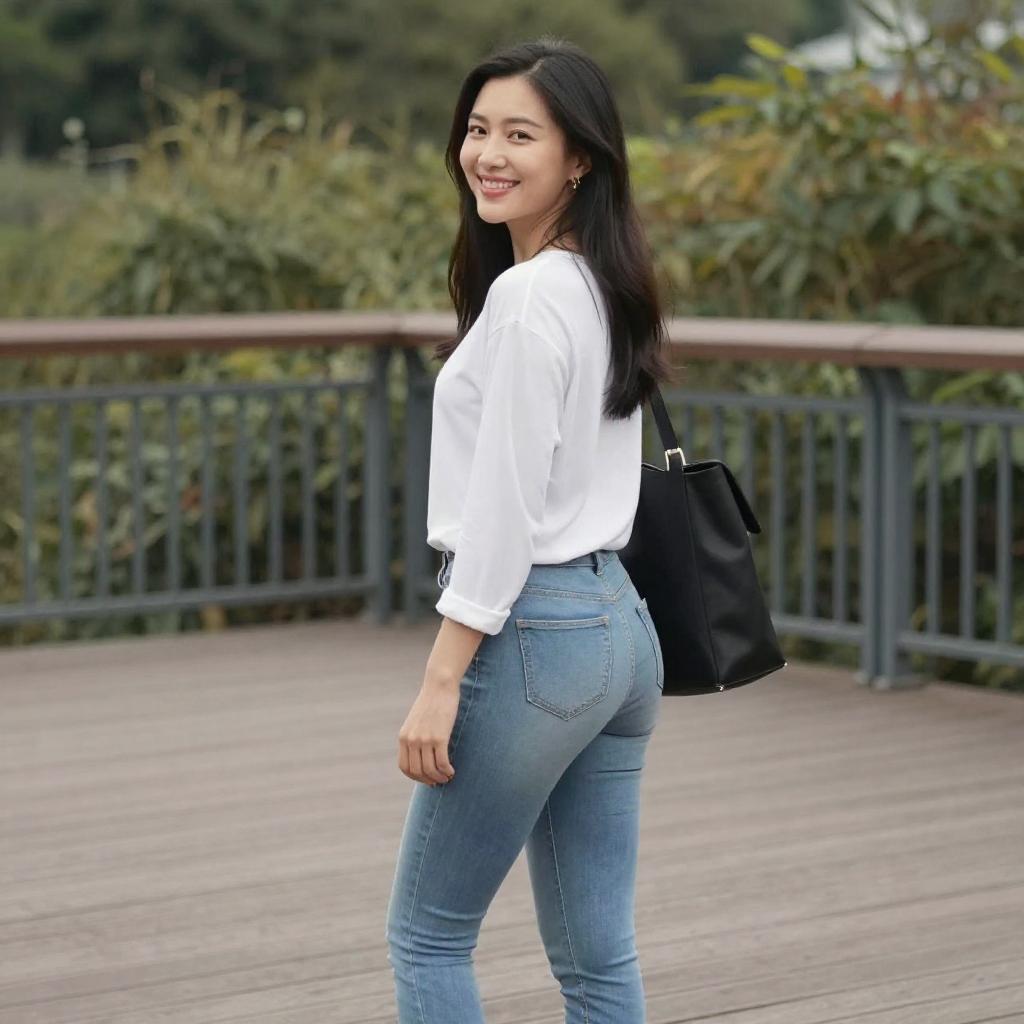 Photograph of a smiling Asian woman with long black hair, wearing a white long-sleeve shirt, light blue tight jeans, and a black shoulder bag. She stands on a wooden deck, looking back over her shoulder. Greenery and metal railings are in the background.