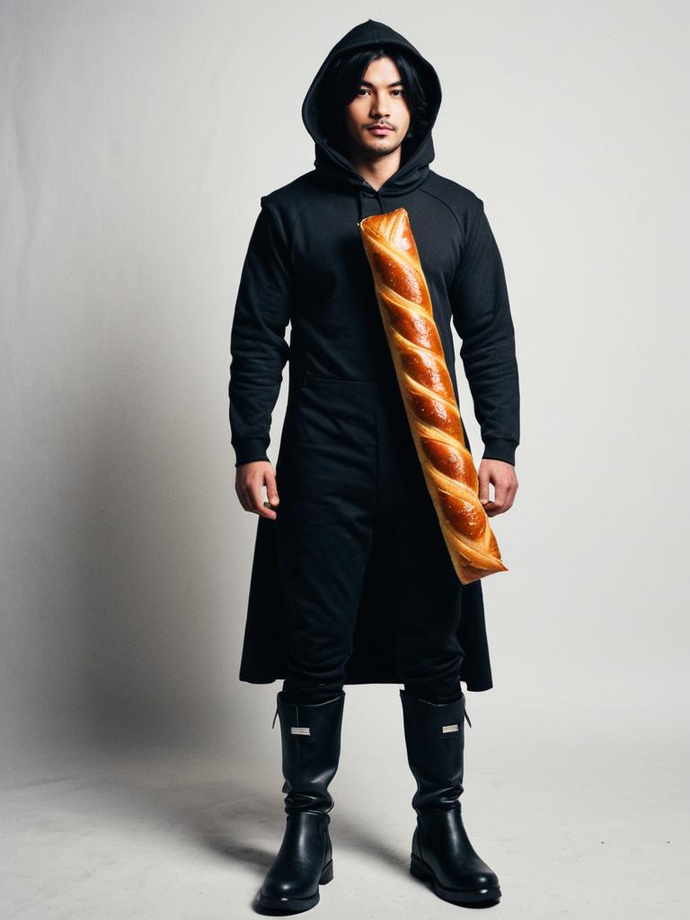 Sausage roll costume, solo, male focus, 1boy, standing, full body, long sleeves, hood, looking at viewer, web address, black hair, closed mouth, realistic, boots