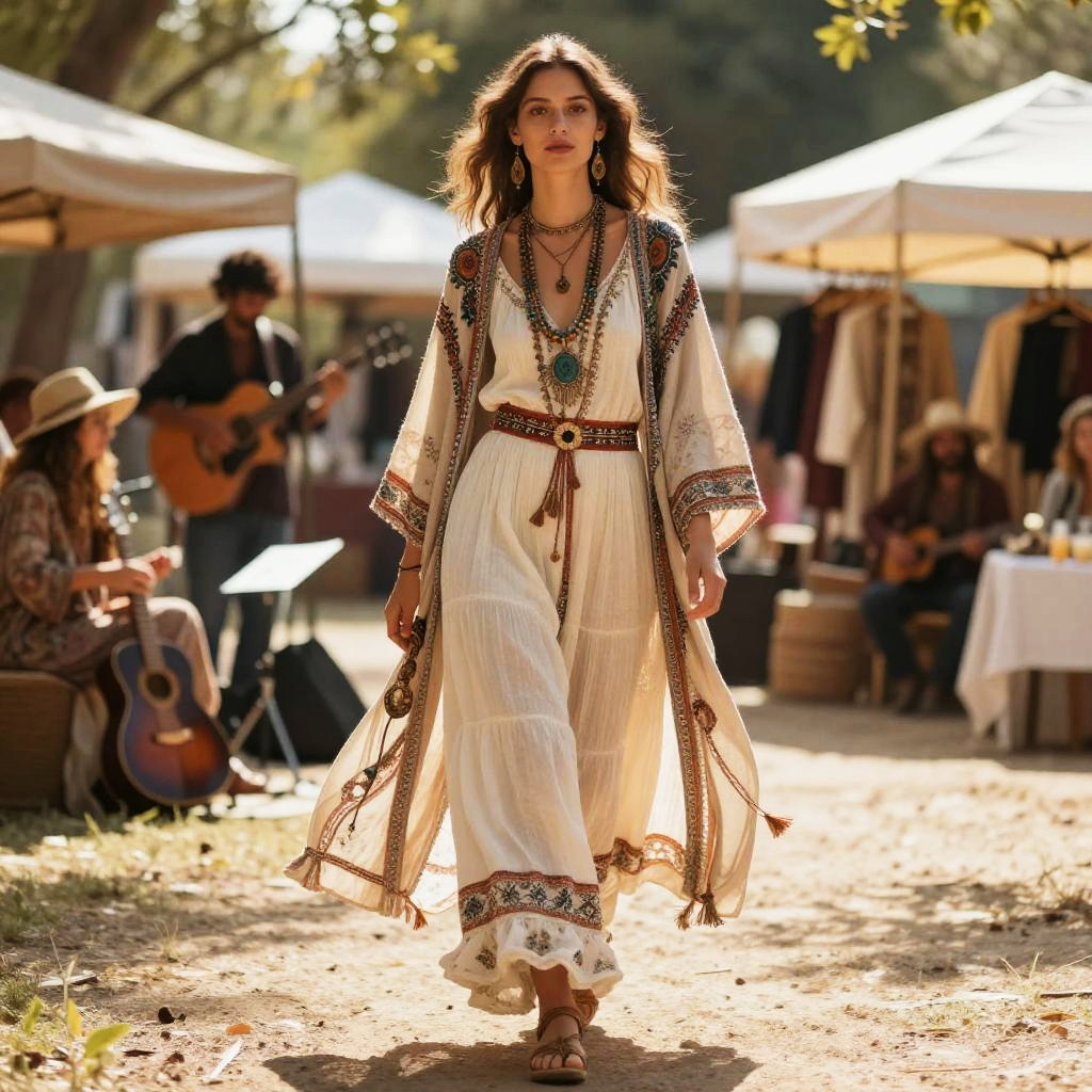 Fashion style generator producing bohemian chic ensembles featuring flowing fabrics, earthy tones, layered accessories, and vintage patterns, styled in a sunlit outdoor market scene with artists and musicians, capturing free-spirited elegance