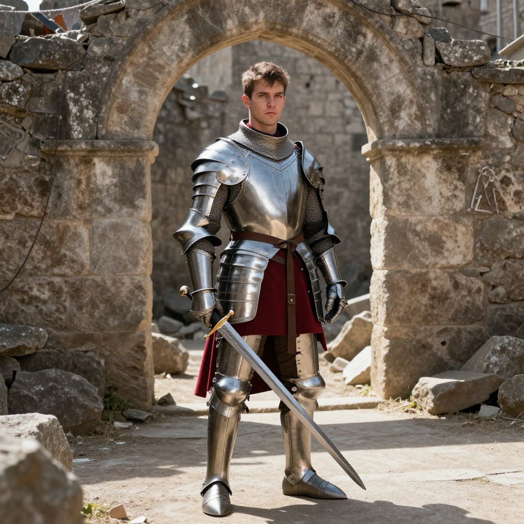 Photograph of a handsome, young man with short brown hair standing confidently in a sunlit, ancient stone archway. He's wearing shiny, medieval-style silver armor with a red cloth underneath, holding a sword in his right hand. The background shows crumbling stone walls and debris, suggesting an abandoned castle. The sunlight highlights his armor, casting shadows on the ground.