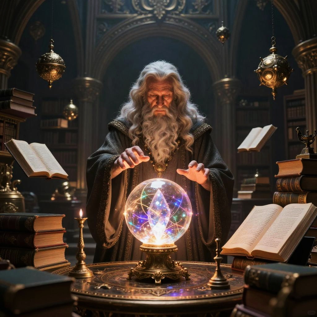Magico, an ancient magical library filled with floating spell books and glowing magical artifacts, a wise wizard in mysterious robes channeling arcane energy from a crystal orb, intricate details, atmospheric lighting with a sense of wonder and mysticism.
