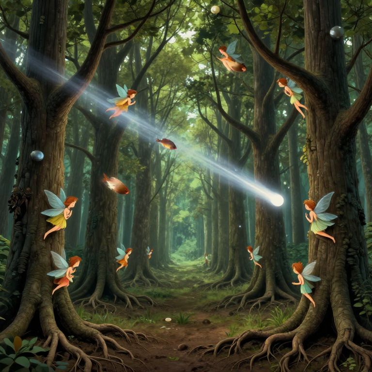 Digital fantasy artwork depicting a dense, sunlit forest with tall, dark brown trees. Delicate, orange and white fairy-like creatures with translucent blue wings are scattered throughout, some hovering, others perched on tree trunks. A bright, white comet-like beam of light shoots diagonally from the upper left to the lower right, illuminating the fairies and creating a magical atmosphere. The forest floor is dirt with patches of grass. The background fades into a green, misty distance, enhancing the enchanted forest vibe. The fairies' wings reflect light, adding a magical glow to the scene.