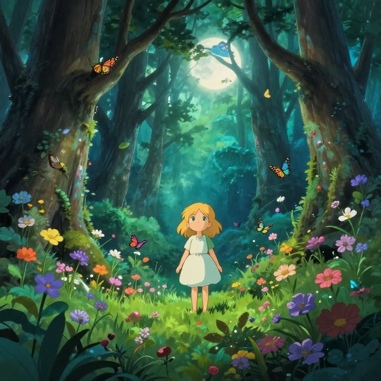 An enchanting illustration in a whimsical style reminiscent of Studio Ghibli's captivating narratives, this scene depicts a young girl with golden tresses and emerald eyes standing at the threshold of a verdant forest glade. The tranquil woodland, teeming with vibrant wildflowers and iridescent butterflies, gradually transitions into an enchanted grove bathed in ethereal moonlight. This emotional gradient evokes a sense of serenity and wonder, drawing viewers into a world where magic seamlessly intertwines with nature's beauty. Captured through the unique perspective of a hidden woodland sprite, this image invites exploration of the mysterious secrets concealed within its enchanted embrace.