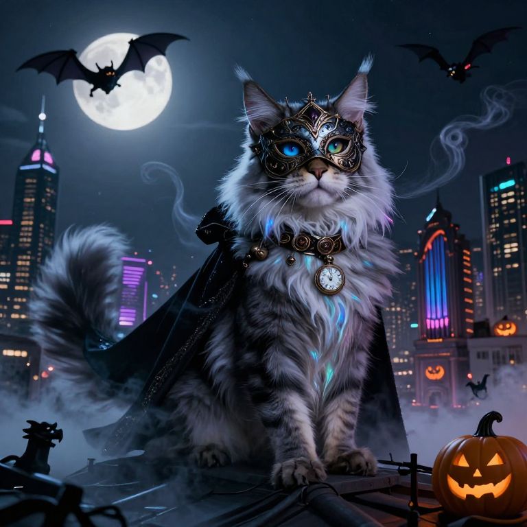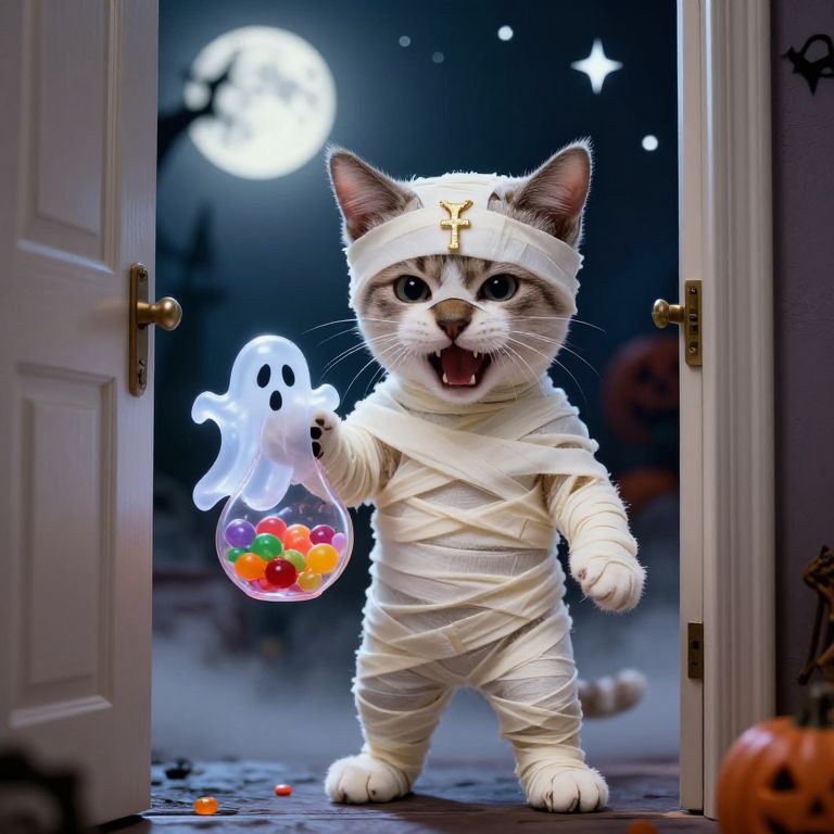 \"Create a hyper-stylistic image of an adorable kitten dressed as a mummy for Halloween, with his body wrapped entirely in tissue paper, creating a miniature, furry sarcophagus, The kitten's eyes sparkle with mischief as he playfully snarls at the viewer, his little face a picture of cute, bandaged ferocity, He wears a miniature mummy's headpiece, complete with a tiny, golden ankh, and his paws are wrapped in tiny, tissue-paper wrappings, The kitten stands at an open door, holding out a tiny pale of candy that is designed with a ghost theme, complete with a translucent, glowing face and a wispy, ethereal handle, The pale is filled with a assortment of colorful candies, and the kitten's paw is extended, as if anticipating even more treats, The background is a magical Halloween night, complete with a full moon, twinkling stars, and a spooky, misty atmosphere, Incorporate intricate details and textures to bring the kitten and his surroundings to life, with a focus on capturing the sense of playful, spooky fun that pervades the scene