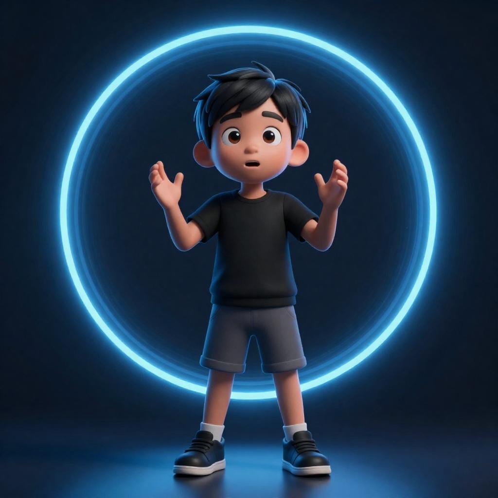 A vibrant CGI character with a pink, flame-like head and large, expressive eyes smiles brightly. The character wears a black, sleeveless dress and stands against a blurred, colorful background with blue and white bokeh lights. The character's flames have a soft, glowing ure.