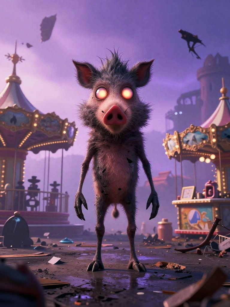 Spooky stylized boar character standing upright in the center of a ruined carnival, huge glowing eyes staring at the viewer, long skinny limbs, surrounded by abandoned carousel and shattered ticket booth with broken attractions and debris, thick fog filling the air, cinematic wide-angle shot, dark whimsical fantasy style, highly detailed 3d illustration, soft volumetric pale violet twilight light, high resolution