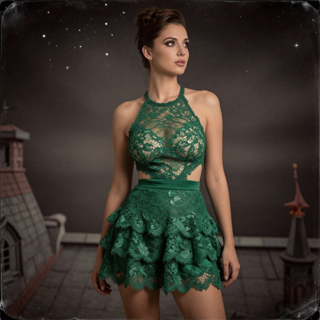 A lean woman, Collodion wet plate style, sophisticated cocktail style, forest green lace dress, halter neckline, sleeveless, cut-out waist detail, tiered mini skirt, scalloped hem, solid underlay, standing on a Wonderland rooftop with starry skies, gazing at the stars. Sexy. Pretty face and beаutiful eyes. Big breasts
