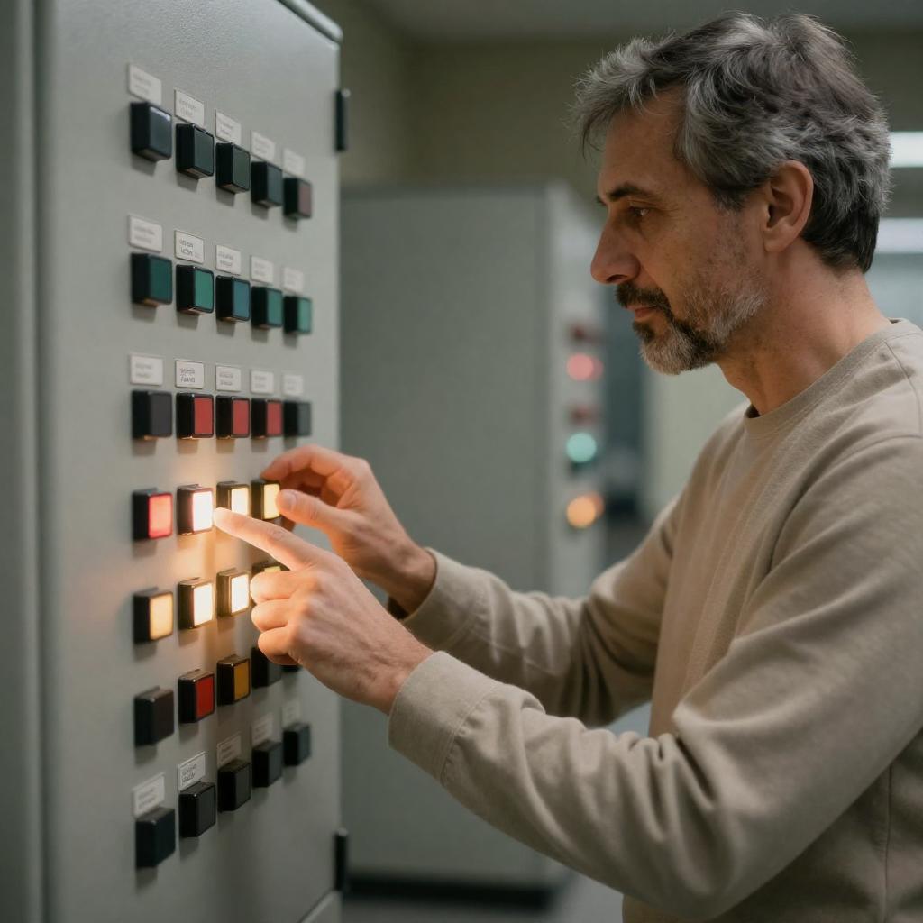Photograph of a man with short brown hair and a beard, wearing a dark gray long-sleeve shirt, leaning forward with a surprised expression. Beside him, an older man with gray hair, glasses, and a blue-striped tie, adjusts his glasses. They are in a dimly lit room with multiple blue-lit computer screens in the background. A yellow machine is in the foreground.