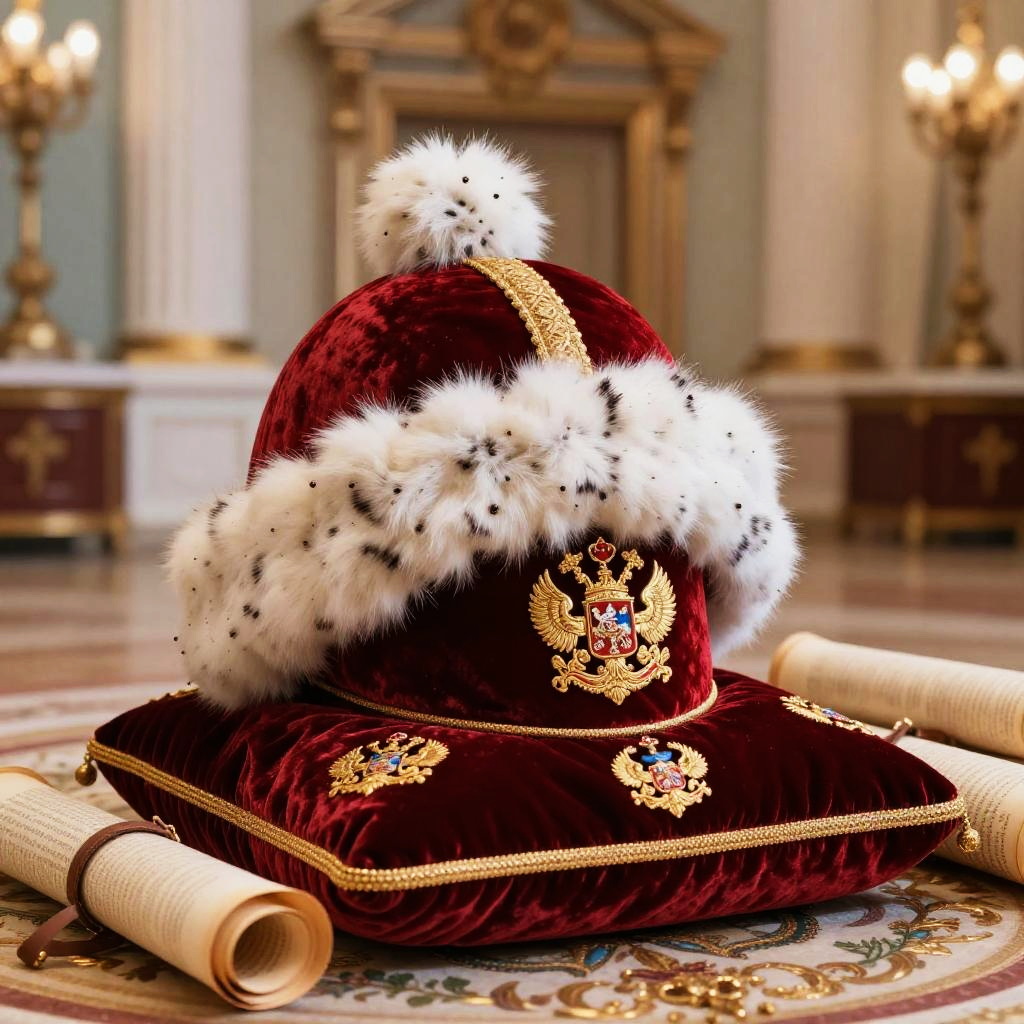 A majestic tsar hat made of deep red velvet and white fur trim, resting on a royal velvet cushion, surrounded by ancient scrolls and Russian imperial symbols in a grand hall