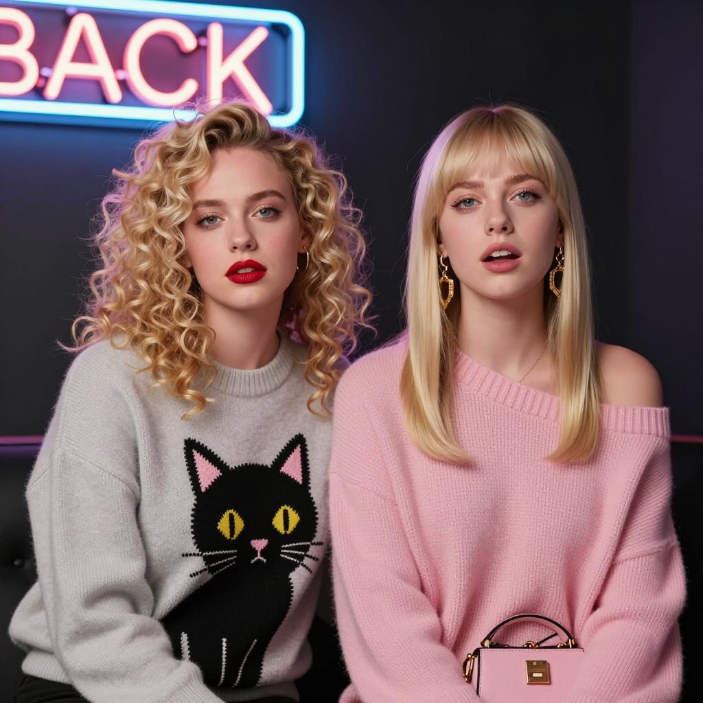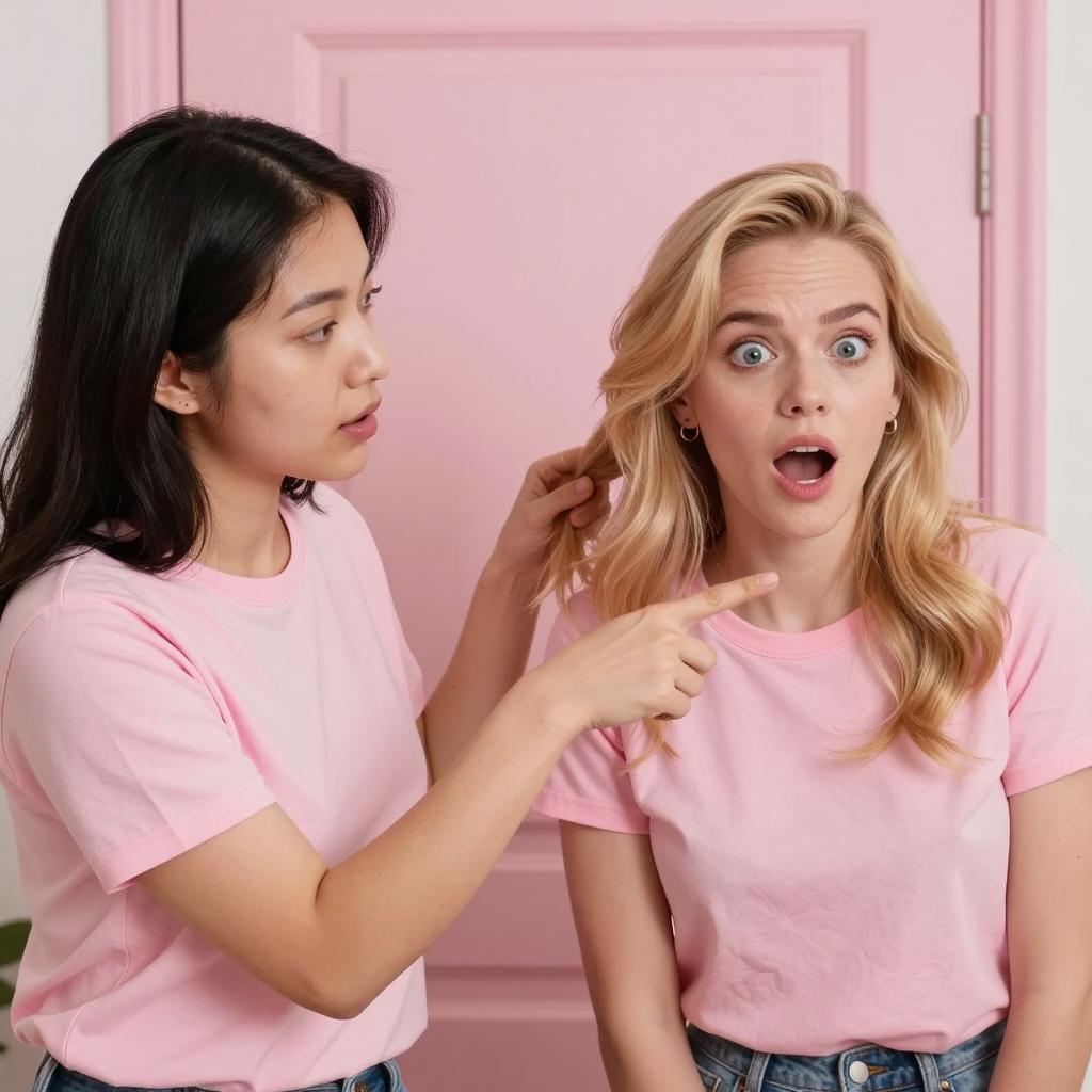 Two women in pink shirts with one wearing a floral blouse, lean forward. Woman on left has black hair, medium build, pulls up blonde woman's hair. Blonde woman, medium build, open mouth in surprise, points at something. Pink door background, close-up.