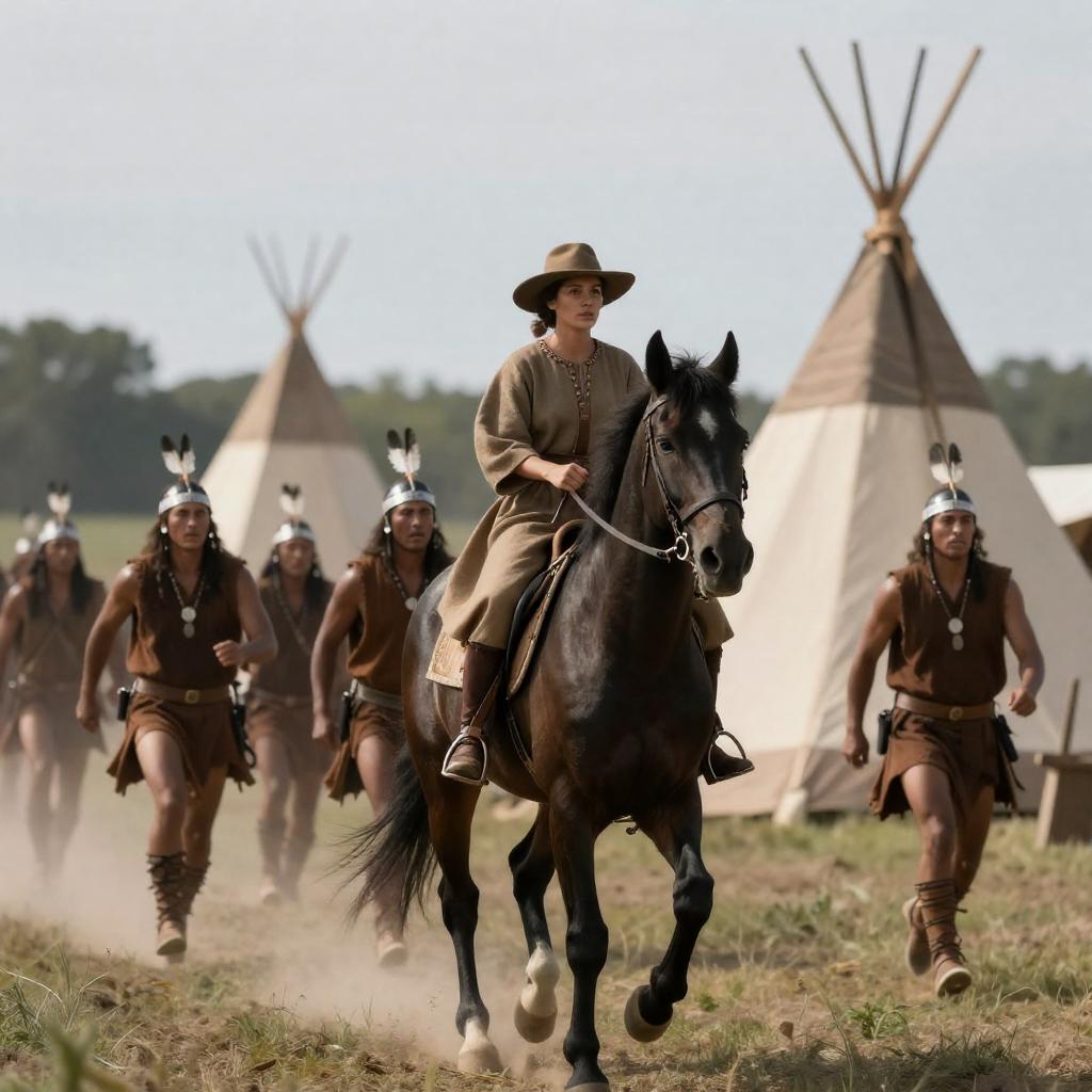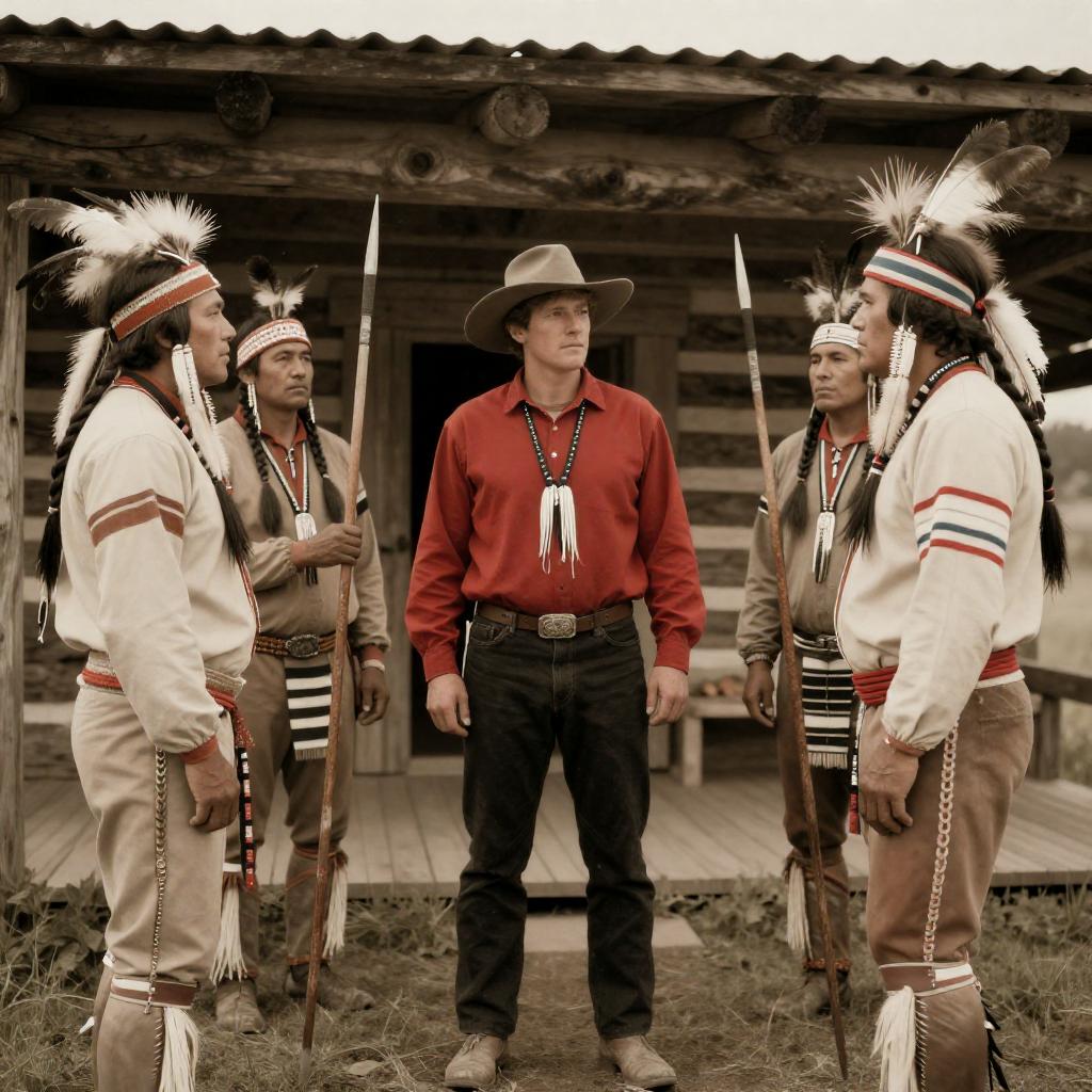 Photograph of a movie scene from "A Man Called Horse." Richard Harris, shirtless with muscular build, stands in the center with arms outstretched, facing two Native American men in fur robes. Background includes additional Native Americans in traditional clothing. The scene has intense facial expressions. Richard Harris wears a headband. Wooden wall backdrop.