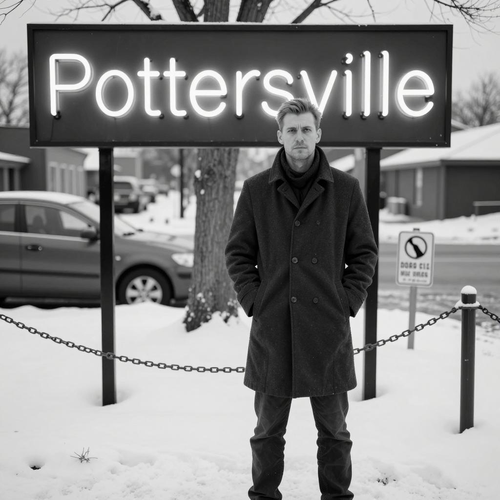 Black and white photograph of a man wearing a dark overcoat and trousers, standing on snow-covered ground. He is positioned in front of a neon sign that reads 'Pottersville'. The background includes parked cars, a 'No Dogs Allowed' sign, chain barriers, a tree, and buildings partially covered in snow. The man has short hair and a serious expression.