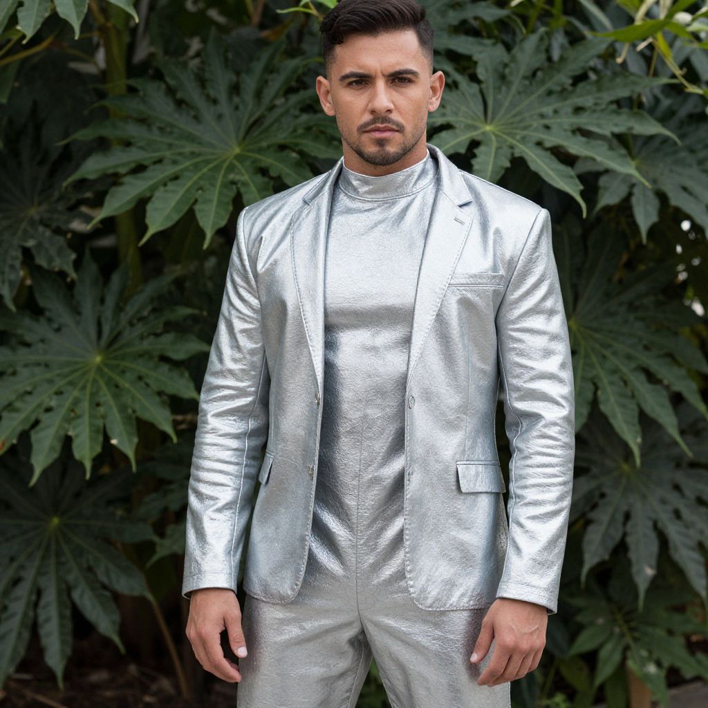 Photograph of a man with short, dark hair and a trimmed beard, standing against a backdrop of large, green, leafy plants. He is wearing a shiny, metallic silver suit with a high-collared shirt and a matching silver blazer. The suit's texture is reflective and smooth, catching light. His expression is serious, and he stands with a slightly forward lean. The contrast between the metallic suit and the dark green leaves creates a striking visual. The overall style is modern and fashion-forward.
