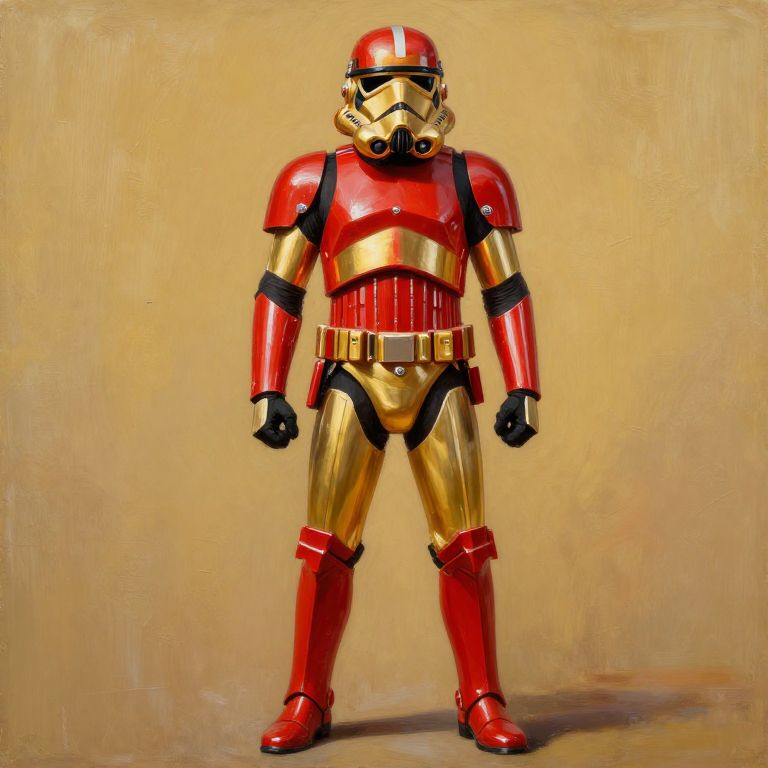 Natural Oil painting of a Stormtrooper in glossy red and brilliant gold, full body, a logo of the San Francisco 49ers on the armor, style of Michelangelo,