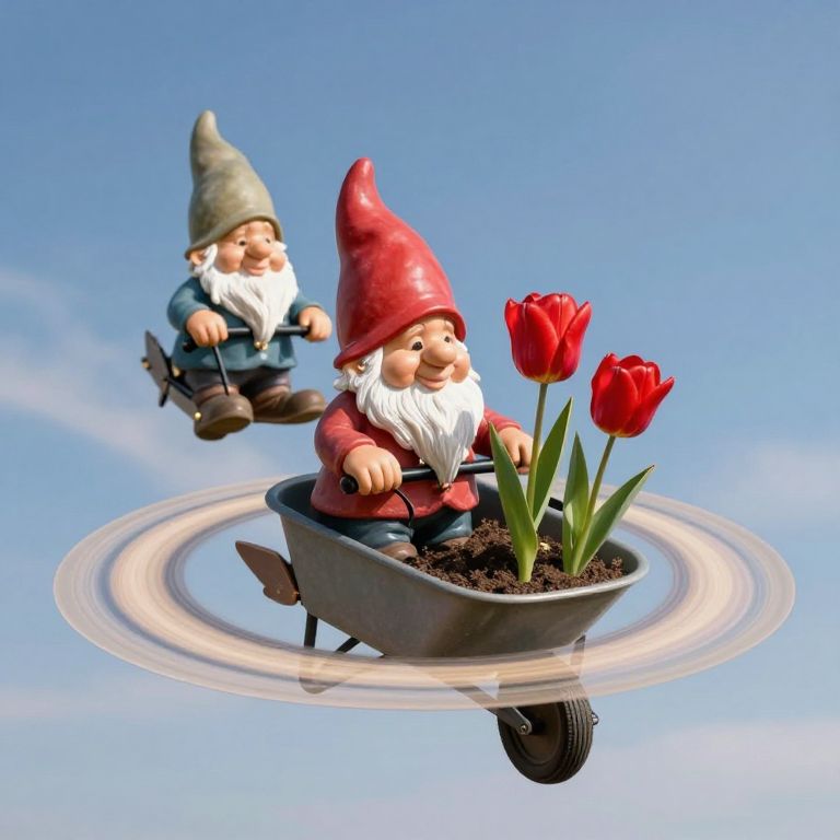 CGI image of two whimsical, bearded garden gnomes with red hats, flying in wheelbarrows with red tulips against a clear
