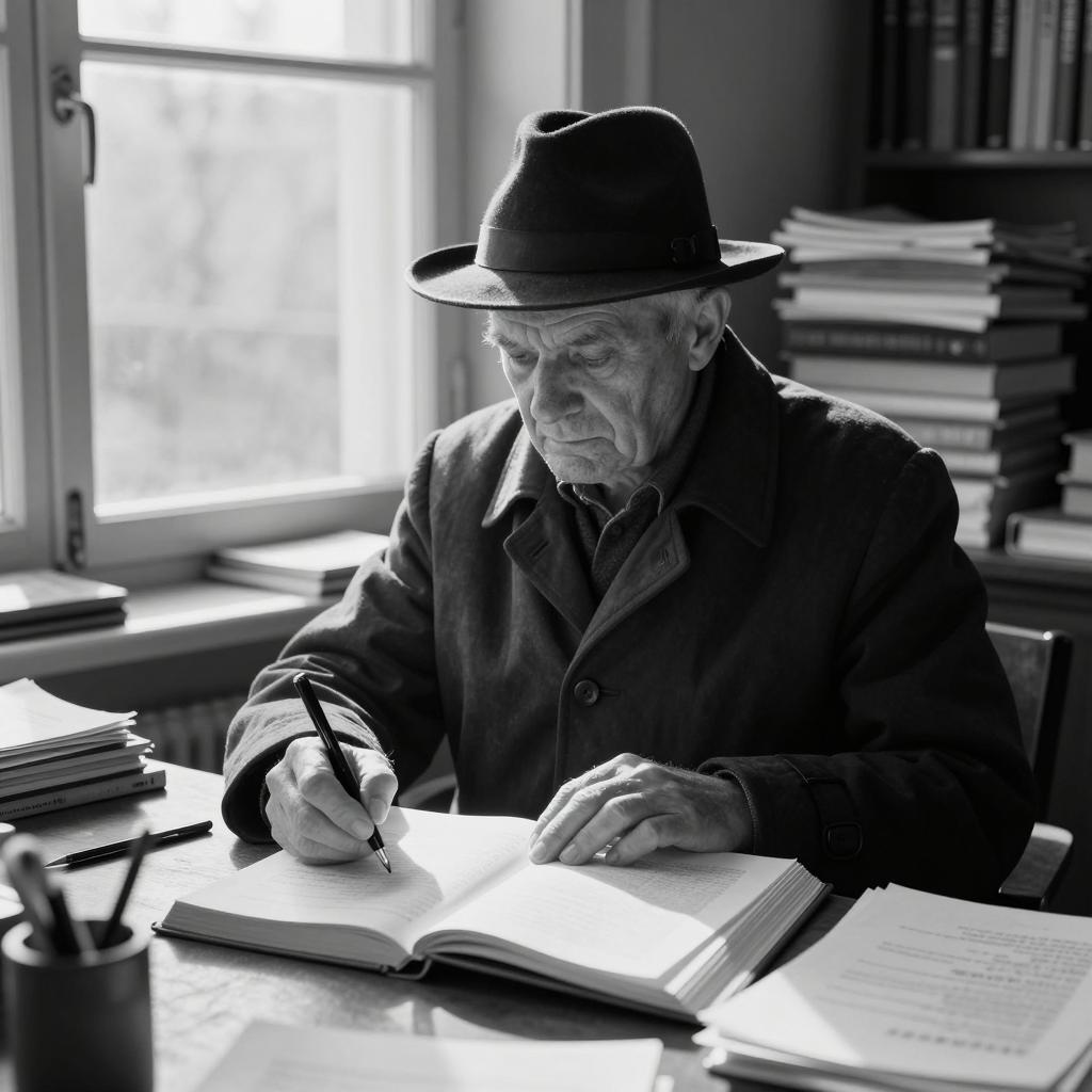 Sepia-toned photograph of an older man with a lean face, wearing a distinctive hat with curled edges, leaning forward with hands clasped. His intense gaze is directed to the side, mouth slightly open. Dark background, minimal shadows.