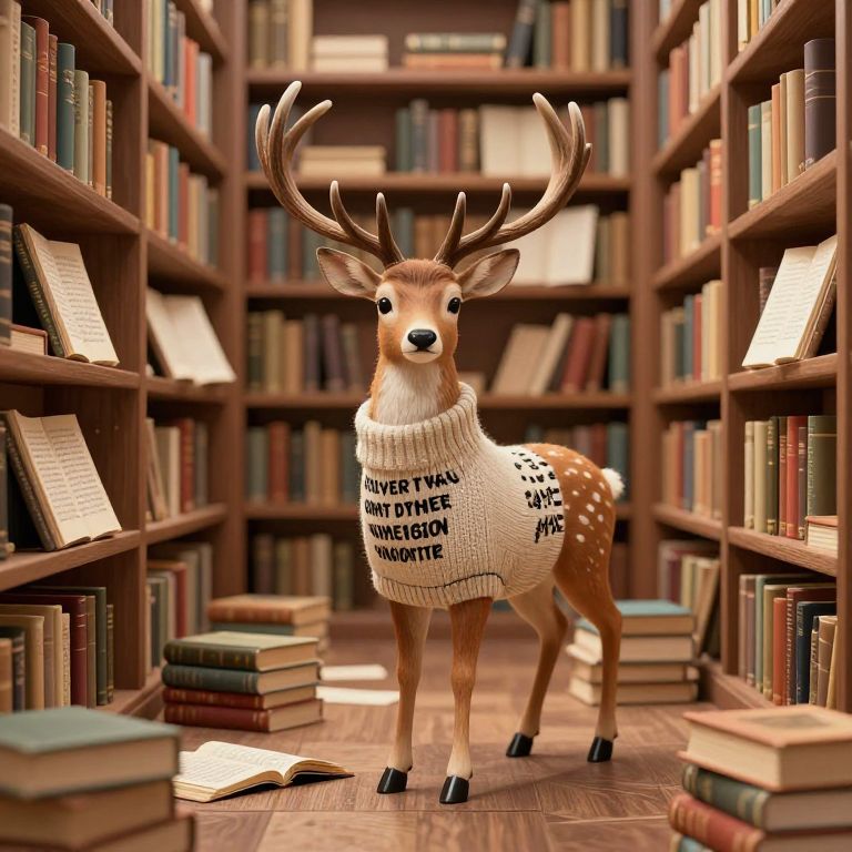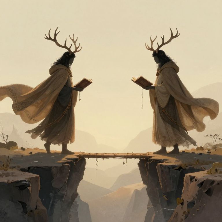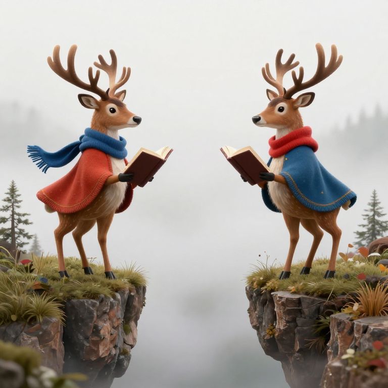 Two anthropomorphic deer, clad in colorful cloaks and scarves, stand on opposing cliff edges, each holding open books as they engage in a silent exchange, their presence bridging the gap between two floating islands shrouded in misty tranquility.