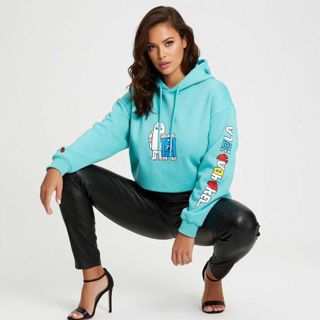 Photograph of a young woman with medium brown skin and long, wavy dark brown hair. She is squatting with her right knee bent and left leg forward. She wears a light blue hooded sweatshirt with colorful graphics on the sleeves and chest, black leather pants, and black high-heeled sandals. Her expression is neutral, and she has subtle makeup with pink lipstick. The background is plain white, highlighting her stylish, casual outfit. The hoodie's design includes text and small, colorful illustrations. Her confident pose and stylish attire convey a modern, trendy look.
