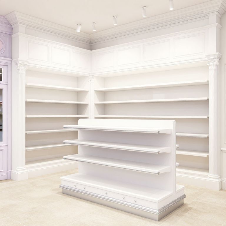 "Spanish Art interior 3d rendering of a store on Disney Main street USA, detailed, white sleek and silver finishings, pastel colors, empty displays, bright,"