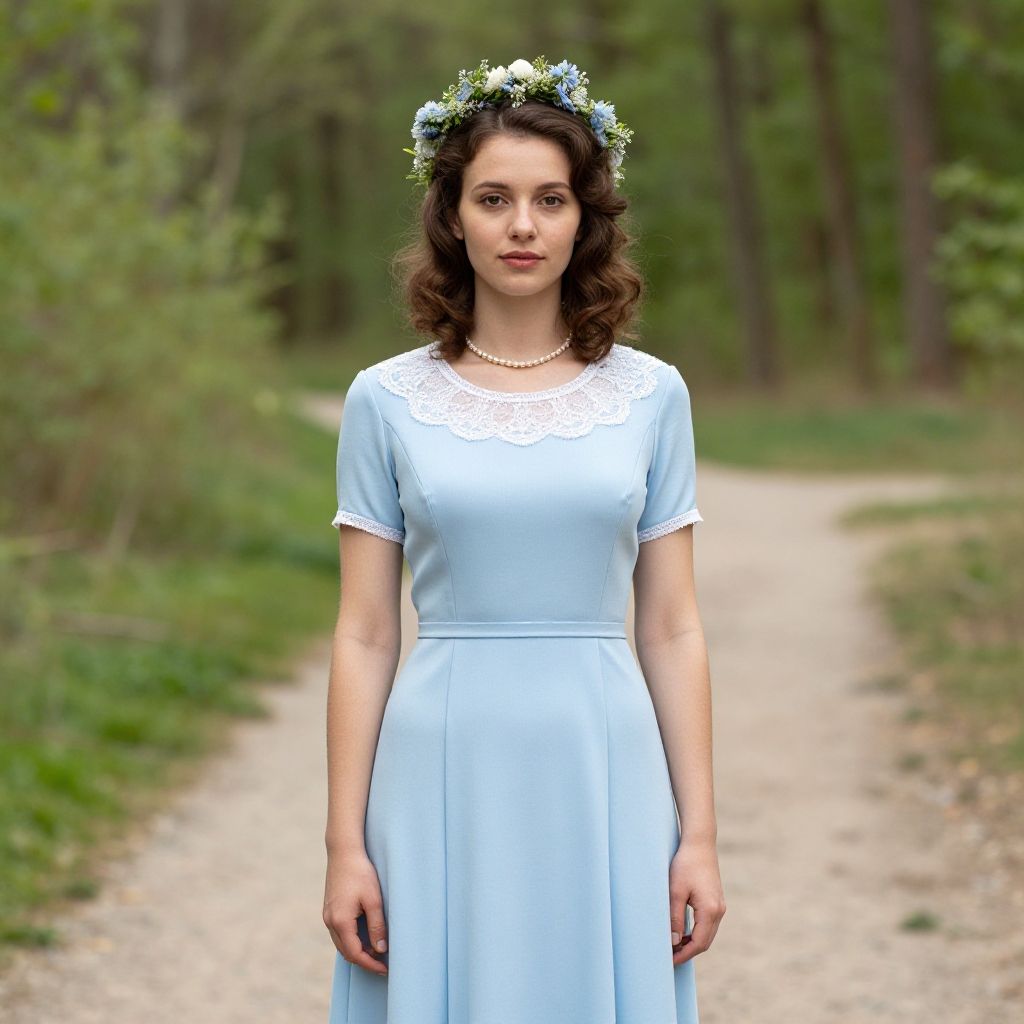 Elegant young woman wearing a soft pastel blue vintage 1950s dress with a modest collar and short sleeves, standing outdoors under blossoming trees. Her curled brunette hair is styled in a classic pinned-back look. The image captures a full body shot with a blurred natural background.