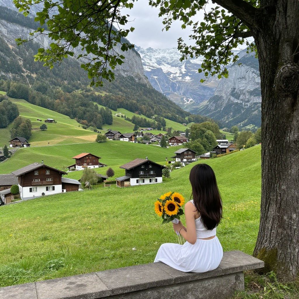 Woman sitting on a stone ledge by a tree, holding a bouquet of sunflowers, overlooking a picturesque village in Lauterbrunnen with four traditional Swiss houses nestled among lush green hills and majestic snow-capped mountains in the background.