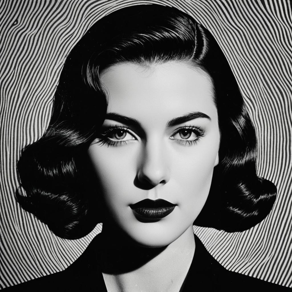 Black and white close-up portrait of a woman with a confident gaze, styled with vintage film noir aesthetics. The woman has dark, wavy hair styled in retro curls, classic makeup including bold dark lipstick, and a smooth complexion. The background features free-flowing, illusory wavy lines creating an abstract, hypnotic effect reminiscent of Man Ray and René Magritte's surrealism. The image evokes a retro, artistic atmosphere with innovative visual techniques.