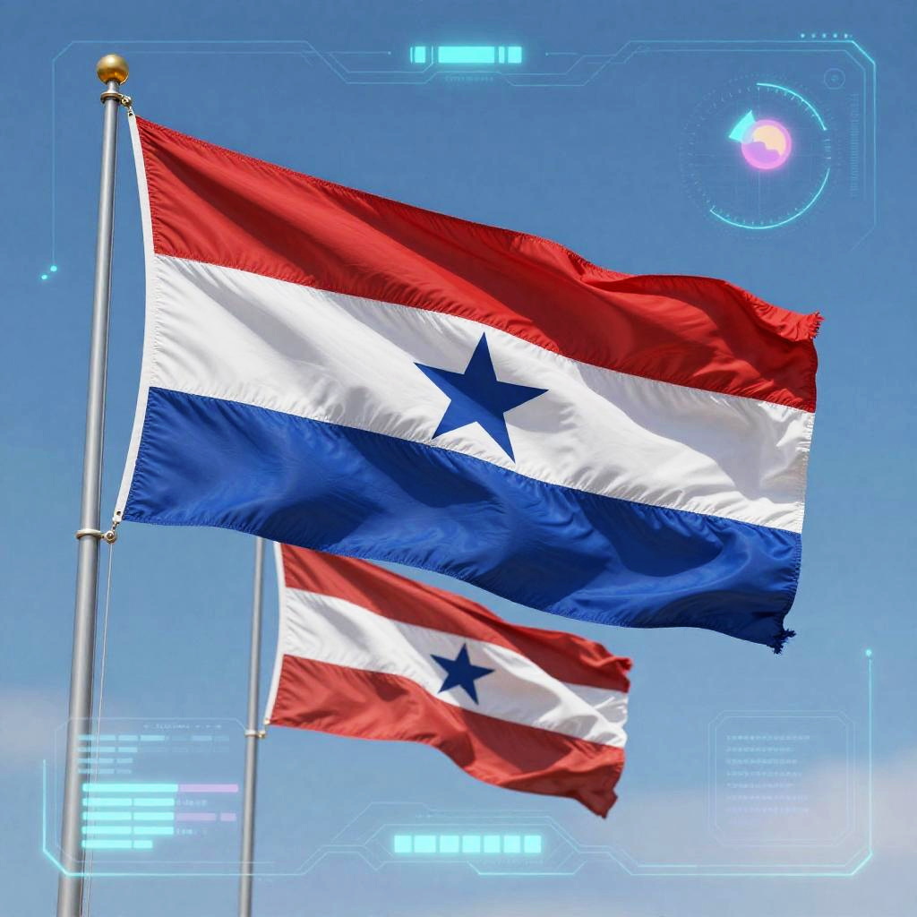 Flag maker AI conceptualizing flags fluttering on poles in a digital environment, futuristic interface with holographic design elements, blending symbolism and innovation in flag creation, neon accents with a high-tech aesthetic.