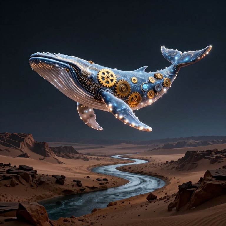 Photorealistic digital artwork depicting a large, glowing blue whale with intricate gears and clockwork mechanisms adorning its body, soaring above a desert landscape at night. The whale's skin is illuminated by bright white and yellow lights, contrasting with the dark, starless sky. Below, a winding river reflects light, surrounded by rugged, rocky terrain. The whale's tail and flippers are detailed with glowing patterns, adding a fantastical element to the otherwise realistic scene. The overall style combines elements of steampunk and fantasy, creating a surreal and captivating image.
