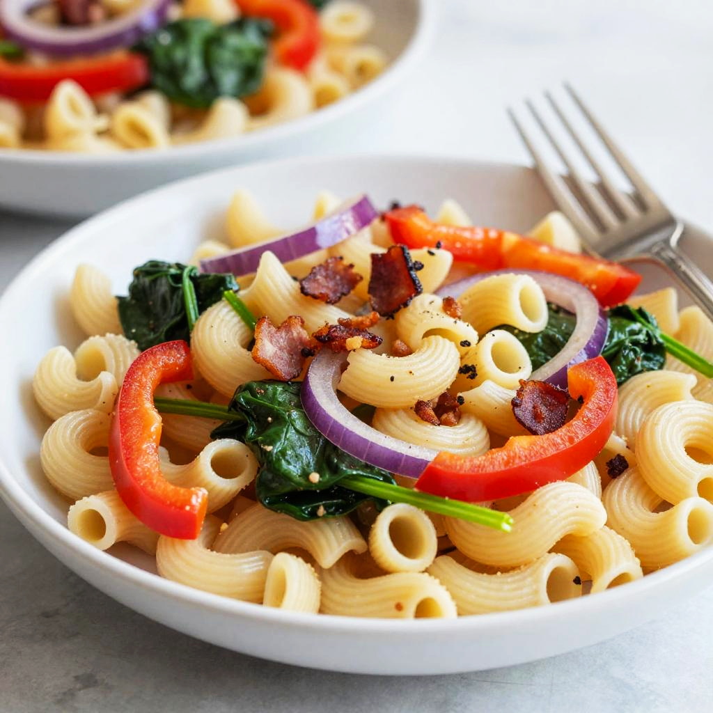 A close-up photo of a white plate and a white bowl, both filled with a colorful salad. The salad features cooked macaroni, vibrant red bell pepper strips, dark purple onion slices, leafy greens, and crispy bacon pieces. The plate is in the foreground with a fork on the left, while the bowl is slightly blurred in the background on a checkered cloth.