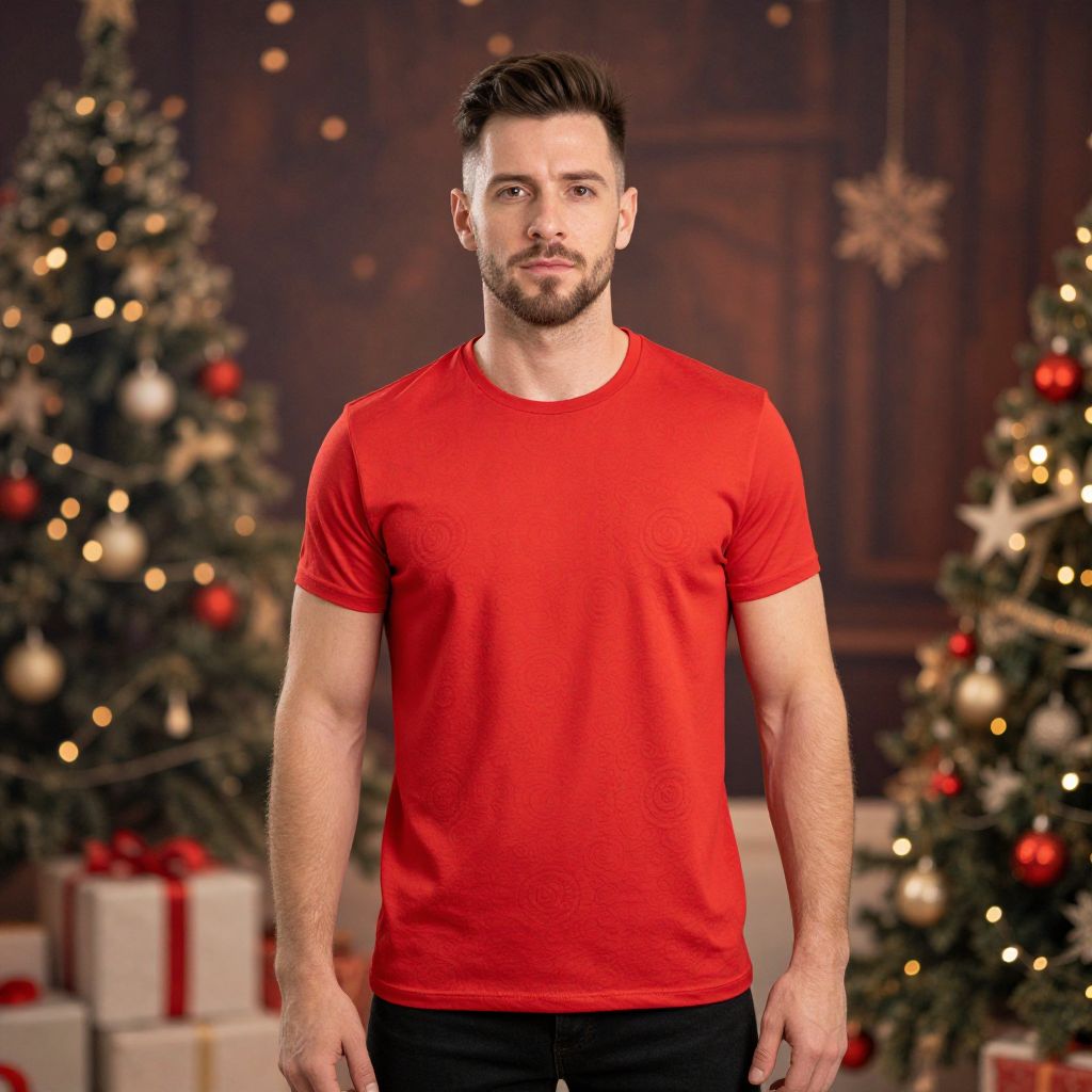 Photograph of a muscular, bearded man with fair skin and short, dark brown hair, wearing a tight, bright red t-shirt and black pants. He stands confidently in front of a festive background featuring two decorated Christmas trees adorned with lights, ornaments, and red ribbons. Wrapped gifts are visible at the base of the trees. The background also includes a dark, wooden wall with a blurred, star-shaped light fixture. The man's serious expression and the warm, holiday lighting create a festive, yet serious atmosphere.