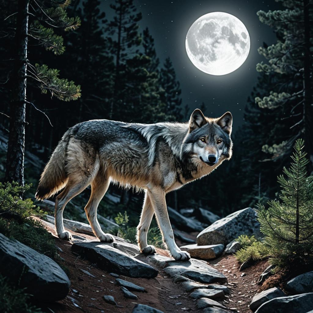 Photorealistic digital painting of a large fox walking on a foggy forest path at night. The scene is illuminated by a bright full moon and a smaller crescent moon, creating a mystical atmosphere. The fox is detailed with reddish fur, white underbelly, and alert expression, surrounded by dark trees and dense fog.