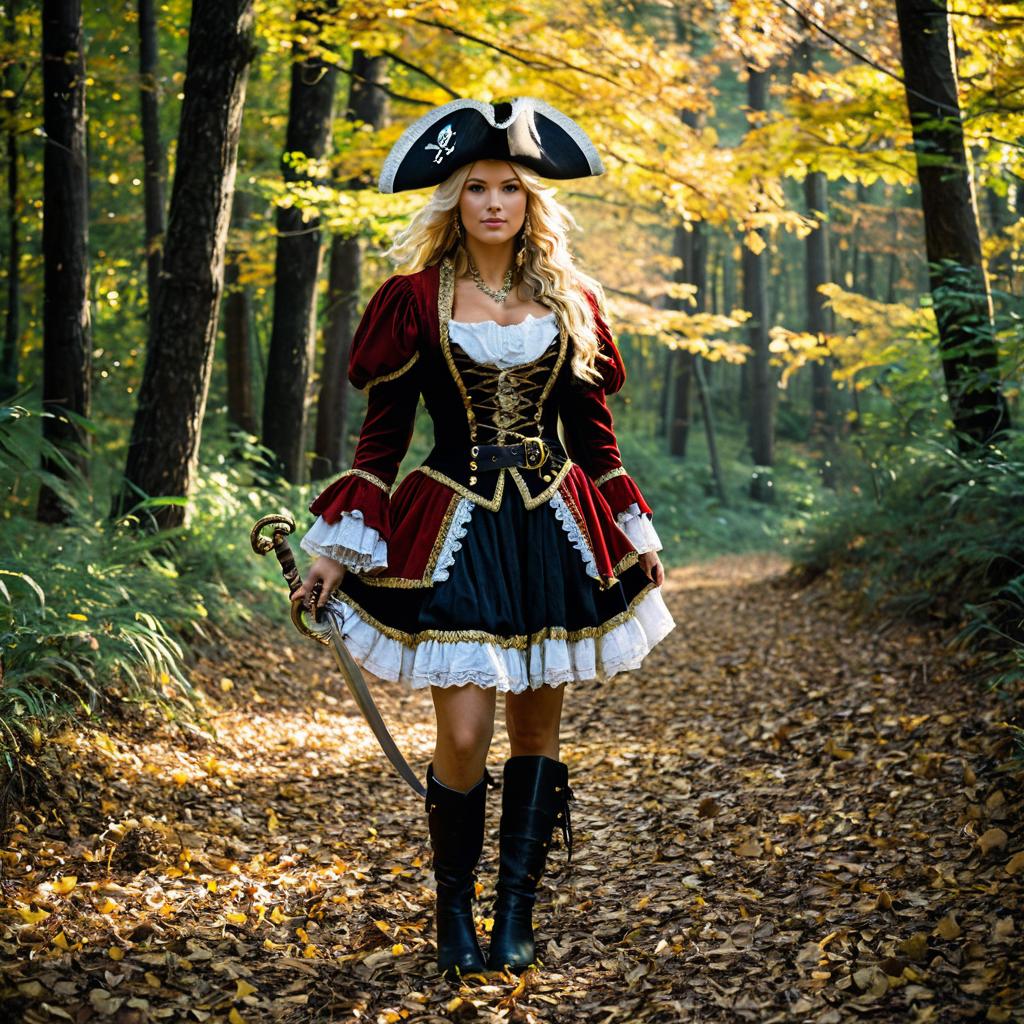 Pirate rave costume, photorealistic, blonde woman, standing on forest path, autumn, wearing 18th century pirate outfit, red and black dress with white lace trim, black boots, black pirate hat with gold accents, gold belt with ornate buckle, forest background, yellow and green leaves, sunlight filtering through trees, confident expression, long wavy hair, detailed ures, realistic lighting, fantasy style, digital art, high detail, full body shot, path with fallen leaves