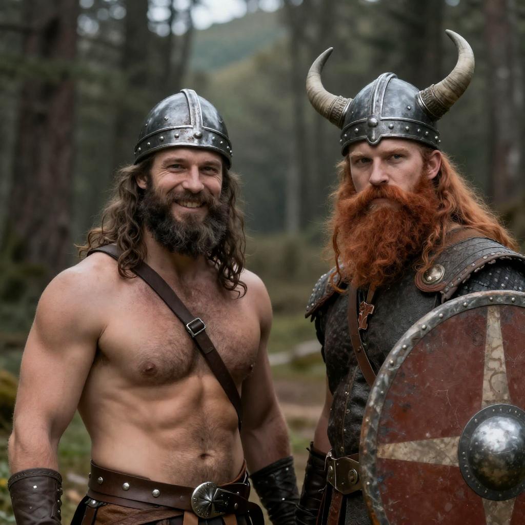 Two bearded Viking warriors in a forest. The left warrior is shirtless with a dark beard and helmet, smiling. The right warrior has a red beard, helmet with horns, and a shield with a circular emblem. Both are standing close, facing forward. Background includes trees and hills.