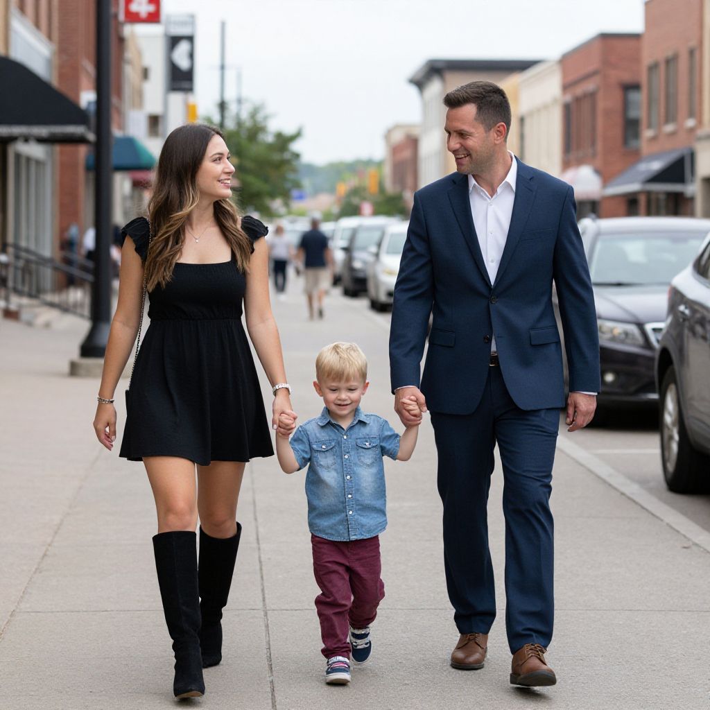Family walking hand-in-hand down a bustling downtown Fargo street, with a woman in a black dress and tall boots leading, a man in a navy suit following, and a young child in a denim shirt and maroon pants between them, all smiling against a backdrop of brick buildings and parked cars.