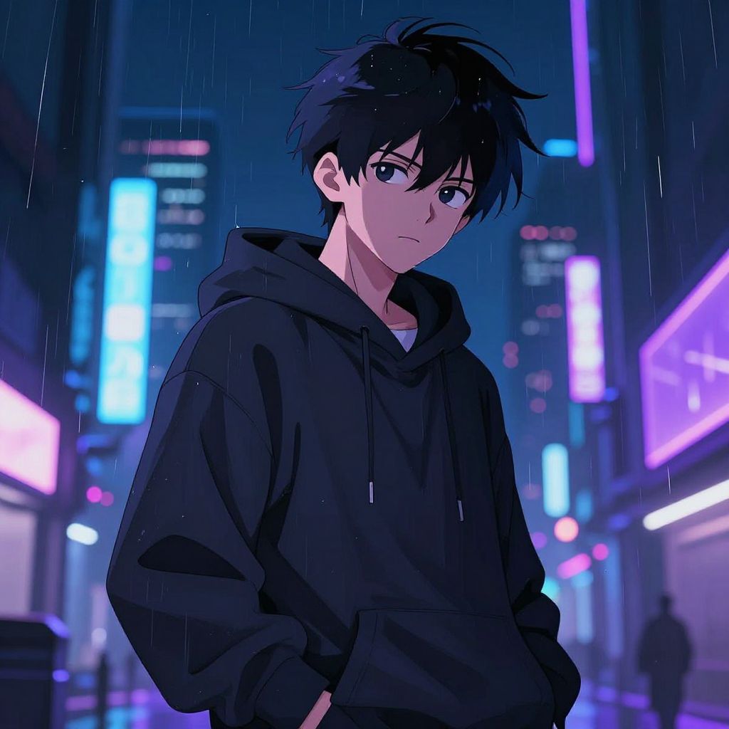 Anime green hair guy in a bustling neon-lit alley, rain-soaked streets shimmering with reflections, wearing a modern streetwear outfit with futuristic elements, intense gaze and confident stance, high contrast and rich color palette in anime style