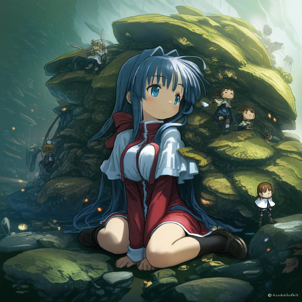 Digital illustration of a blue-haired anime girl with long hair and blue eyes, wearing a red dress with white details, sitting on moss-covered rocks in a mystical forest-like setting. Surrounding her are multiple small doll-like figures dressed similarly, set against a background of green moss and soft light beams. The artwork is in the style of Japanese anime by artist Tsukushi Akihito.