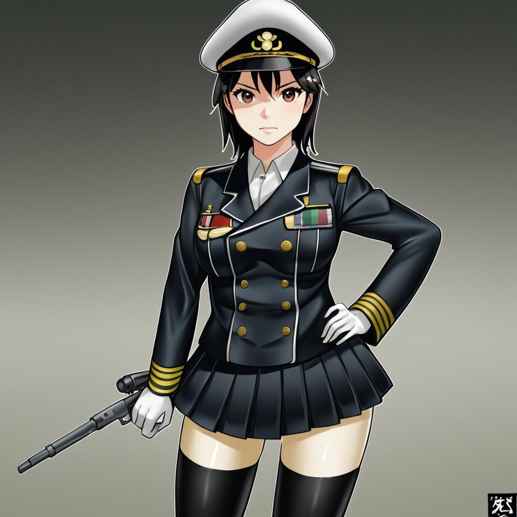 Anime-style illustration of a female naval officer with pale skin, black short hair, and black eyes. She is dressed in a detailed black military uniform with gold accents, a white peaked cap, white gloves, and a pleated skirt. She wears black thigh-high stockings and holds a rifle in one hand. The character conveys a strong and confident demeanor, inspired by the Kantai Collection series.
